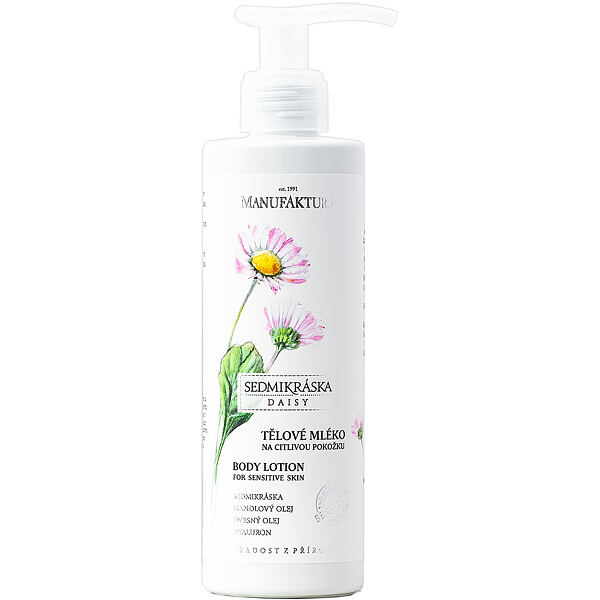 Hydratačné telové mlieko pre citlivú pokožku Sedmokráska s extra jemnou receptúrou s cennými olejmi, sedmokráskovým a ovseným výťažkom, kyselinou hyalurónovou a panthenolom dlhodobo hydratuje, upokojuje, regeneruje a vyživuje suchú, citlivú až podráždenú pokožku.