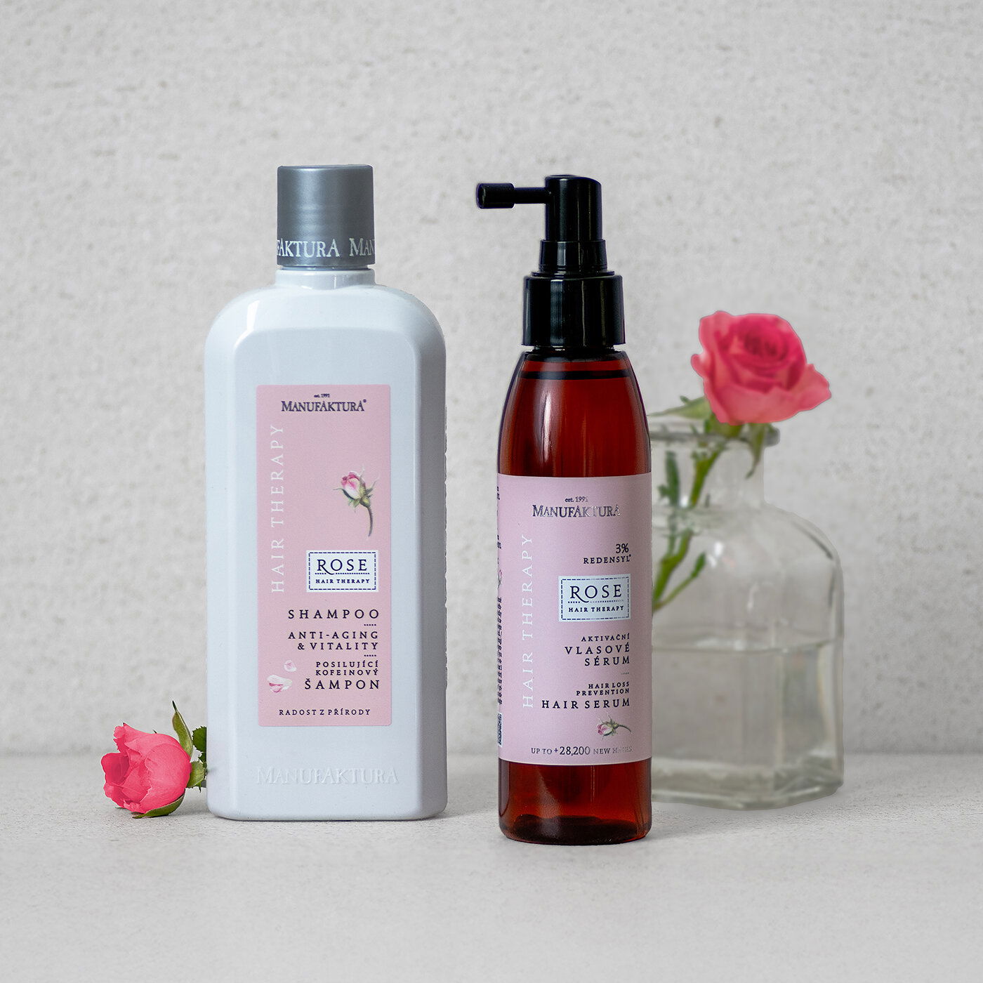 Potešte luxusným rituálom pre silnejšie, vitálnejšie a krajšie vlasy! Exkluzívny darčekový set anti-aging vlasovej starostlivosti z kolekcie Ruža & Žriedlová soľ bol vytvorený špeciálne pre potreby zrelých vlasov – s rešpektom, jemnosťou a láskou k prirodzenej kráse. Dva dokonale zladené produkty z ružovej kolekcie prinášajú intenzívnu posilňujúcu anti-aging kofeínovú starostlivosť, ktorá napomáha spomaľovať prejavy starnutia vlasov, a znižovať ich vypadávanie a navracia im hustotu, vitalitu a lesk. Táto elegantná sada je skvelým darčekom pre ženy, ktoré si chcú dopriať výnimočný zážitok zo starostlivosti o vlasy a každodennú chvíľku luxusu z pohodlia svojho domova.
