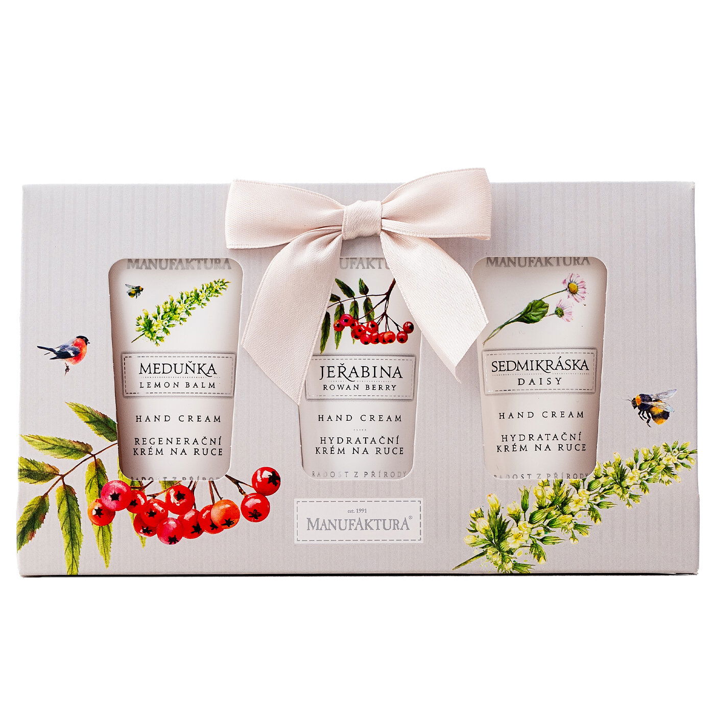 Láska na prvý pohľad aj dotyk! Potešte darčekovým balením najlepších krémov na ruky v praktickom balení „do kabelky.“ Roztomilá darčeková sada obľúbených ošetrujúcich krémov na ruky nadchne všetky ženy a dievčatá, ktoré si chcú zachovať krásne a pestované ruky v každom ročnom období. Čím sú Manufaktura krémy na ruky tak výnimočné? Hĺbkovo hydratujú, intenzívne regenerujú a ochraňujú pokožku, rýchlo sa vstrebávajú, obsahujú vysoké percento prírodných ingrediencií a rukám poskytujú tú najlepšiu starostlivosť. Navyše nádherne voňajú a sú vhodné pre vegánov.