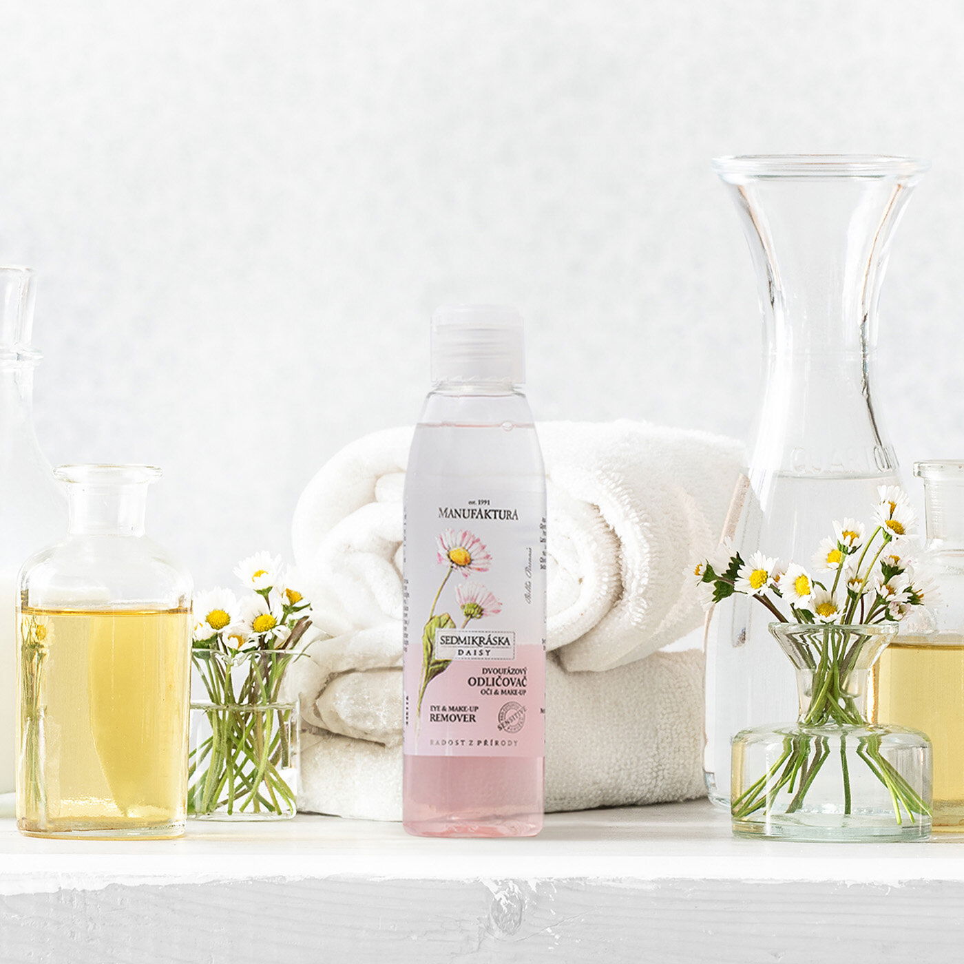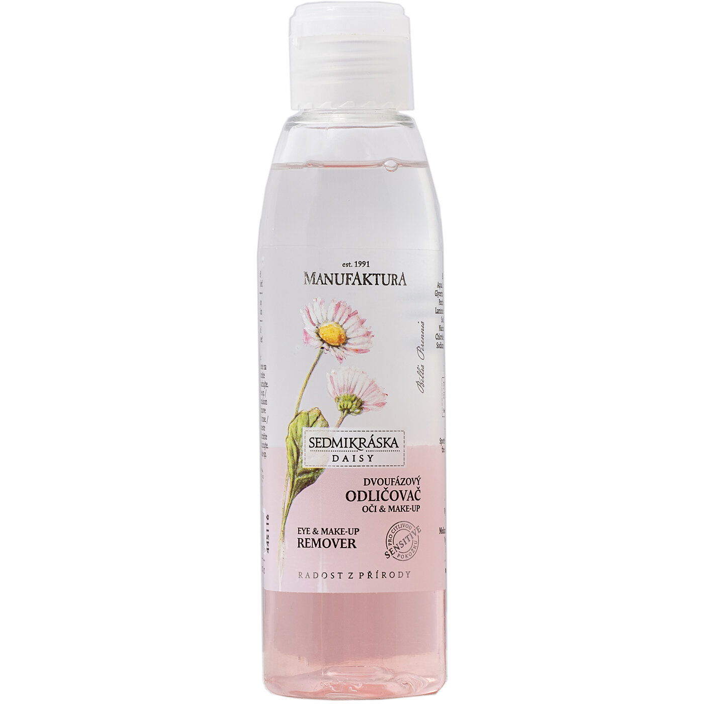 Aby byl produkt účinný i na voděodolný make-up, obsahuje rostlinné oleje, které pomáhají rozpouštět líčidla. Použili jsme především lehké a rychle se odpařující oleje přírodního původu. I tak je u dvoufázového odličovače důležité před použitím důkladné protřepání a co nejšetrnější aplikace – bez zatečení do oka.