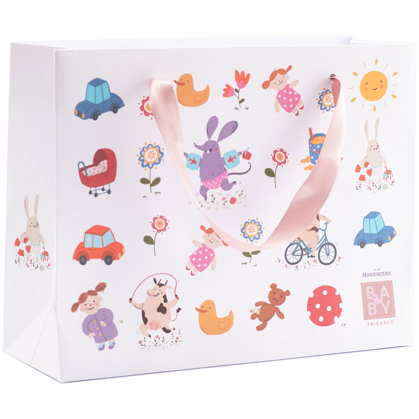 Ukryte našu poctivú a nežnú detskú kozmetiku do prekrásnej tašky a dotiahnite svoj darček k dokonalosti. Roztomilú, v Čechách vyrobenú papierovú tašku s nežnou mašľou, zdobia z jednej strany motívy veselých zvieratiek, ktoré sprevádzajú celý náš rad Baby Friendly, z druhej strany na Vás vykukne smiešna postava veselého zajačika ušiačika.